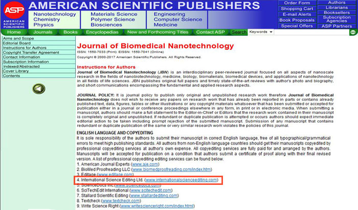 American Scientific Publishers (ASP)出版商推荐国际科学编辑(International Science Editing)的语言润色服务。