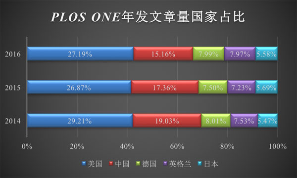 表1 2014~2016年PLOS ONE每年发表论文数量居前5位的国家